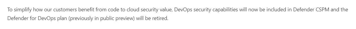 What does this mean? Starting March 1, 2024, Defender CSPM must be enabled to have premium DevOps security capabilities which include: