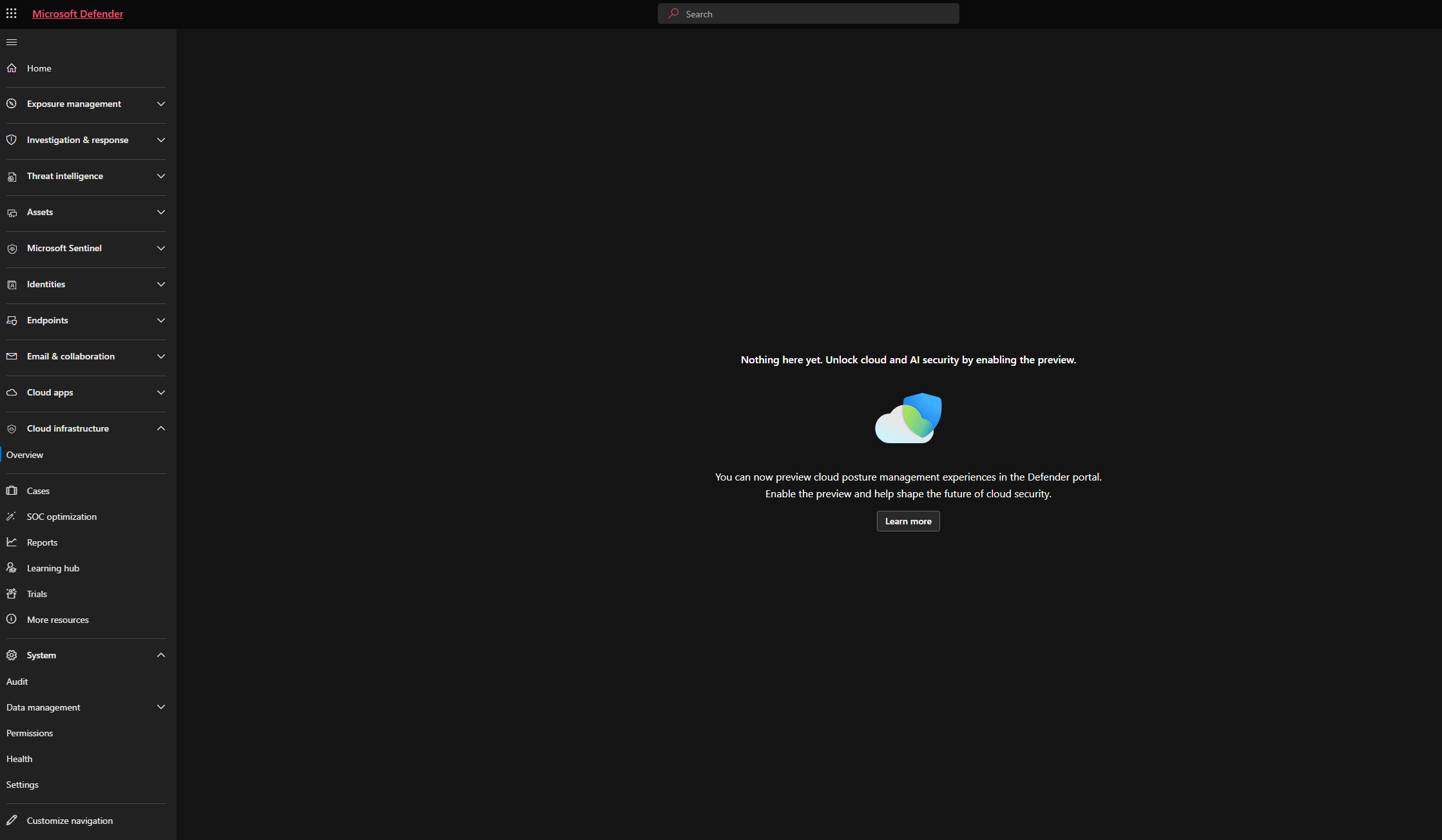 You will have noticed that there is a new menu called Cloud Infrastructure in the security portal. When selecting the overview, you’re presented with the option to enable the feature.