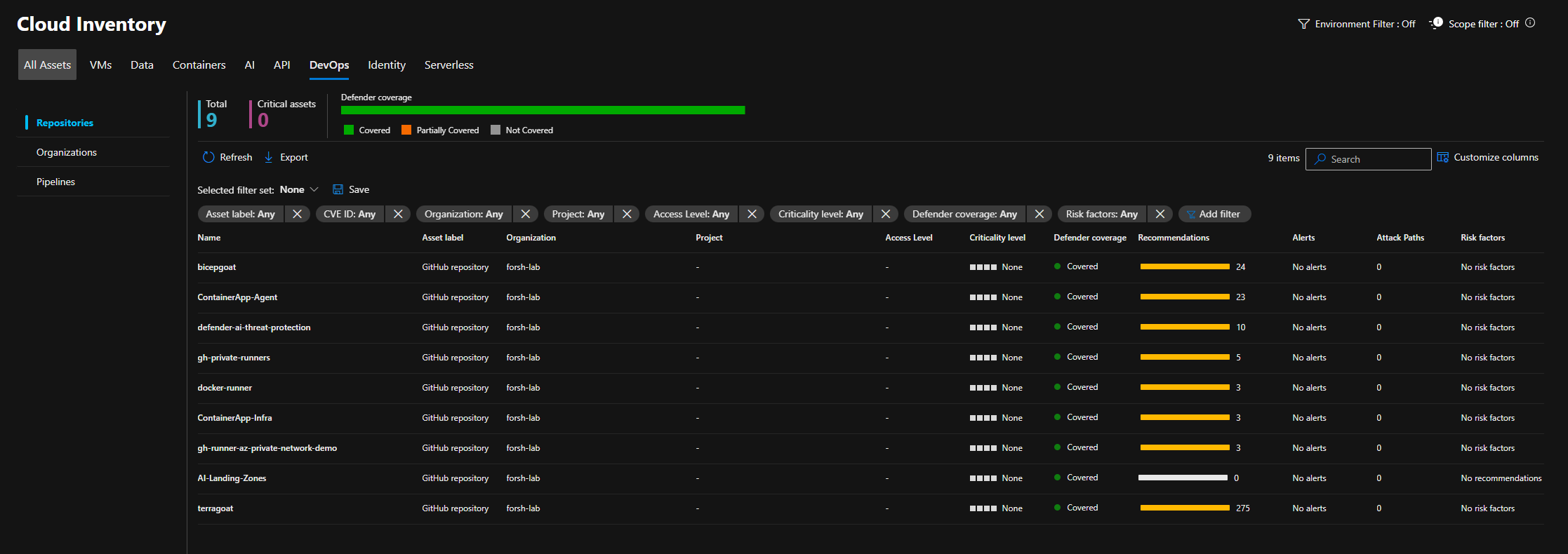 This overview is one of my favourite updates as you can easily switch between the technology domains that Defender is monitoring. The below example shows DevOps security, which covers all repositories, organizations, and pipelines connected to Defender for Cloud.